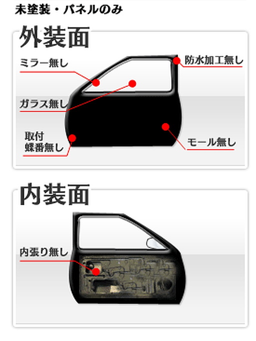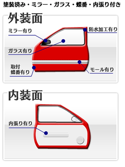 - リサイクル部品ドアは、生産された車輌からはずした部品ですので、既に防水加工等実施済みです
